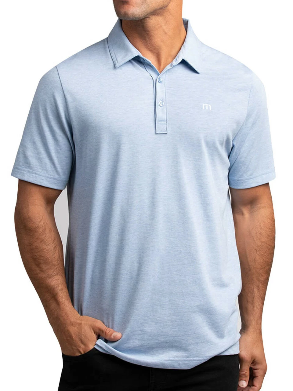 Buy Travis Mathew The Zinna Polo – Heather Light Blue online at GolfBox. Quick drying. 3-button placket with custom TravisMathew buttons. Signature collar stay technology. 64% cotton 36% polyester. Enhanced stretch